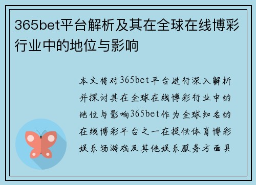 本文将对365bet平台进行深入解析,并探讨其在全球在线博彩行业中的地位与影响。365bet作为全球知名的在线博彩平台之一,在提供体育博彩、娱乐场游戏及其他娱乐服务方面具有重要地位。通过对平台的功能、市场表现、技术创新及社会责任等多方面进行全面分析,本文将揭示365bet在全球博彩行业中的重要作用及其未来发展潜力。