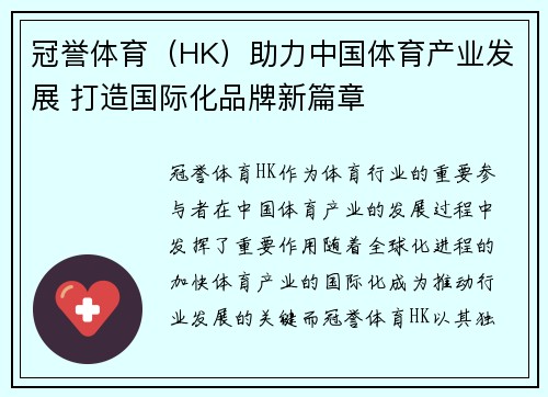 冠誉体育(HK)作为体育行业的重要参与者,在中国体育产业的发展过程中发挥了重要作用。随着全球化进程的加快,体育产业的国际化成为推动行业发展的关键。而冠誉体育(HK)以其独特的视角和战略布局,致力于打造国际化品牌,为中国体育产业注入了新的活力与动力。本文将从四个方面详细阐述冠誉体育(HK)在助力中国体育产业发展、推动国际化品牌建设方面的积极贡献。这四个方面包括:1)冠誉体育(HK)对中国体育产业的战略推动;2)通过国际化赛事平台提升中国体育影响力;3)品牌全球化的营销布局与合作拓展;4)技术创新与数字化驱动体育产业发展。通过对这些方面的分析,可以更加清晰地认识冠誉体育(HK)在国际化进程中扮演的重要角色,并展望其未来在全球体育市场中的发展潜力。